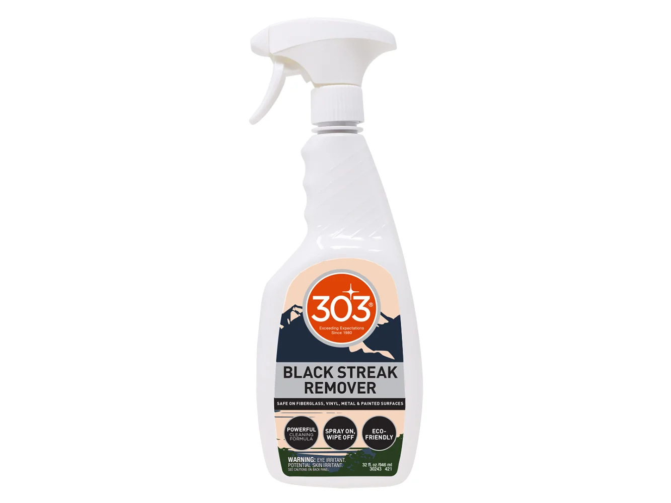 303® Black Streak Remover will keep the siding of your RV looking like new by removing unsightly black streaks with ease. These black streaks occur naturally when dirt and rubber material from an RV’s roof come off after miles of traveling at high speeds. The powerful formula in 303® Black Streak Remover pulls this material and dirt from the surface and allows it to be wiped away, leaving a clean, streak-free finish.