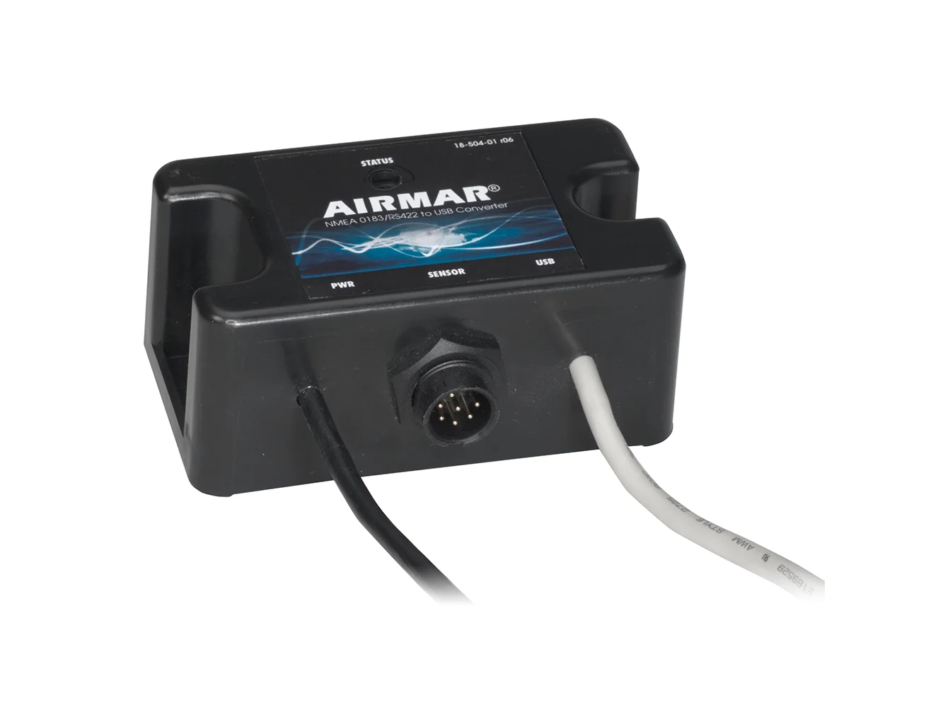 Enables NMEA 0183 data from an Airmar weatherstation or GPS/compass to be sent to a PC through a USB port. USB cable (1.8m/6′) and power cable (1.8m/6′) attached.