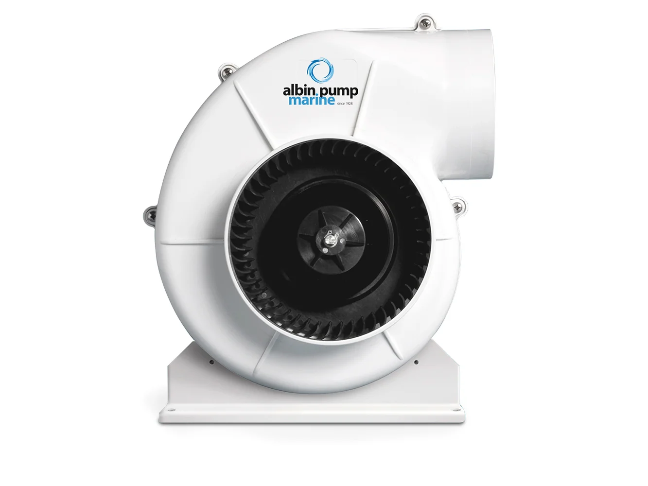 6″ flex mounted marine ventilation 12V radial blower with capacity 750 m3 per h, 441 CFM. Inlet 150mm, outlet 103mm. Body in hermoplastic PA6 high durable white Nylon with integrated blower motor.