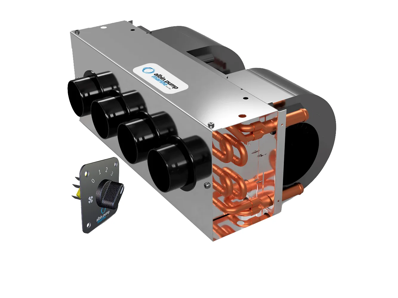 Marine defroster/ heater with 12kW heater coil and double 12V radial blowers. Wiring harness, 4-step control panel and hose adapters included.
