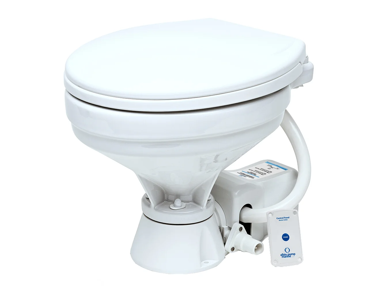 Standard electric comfort toilet with a combined electrical 24V macerator and pump for waste disposal and flushing in one single operation.