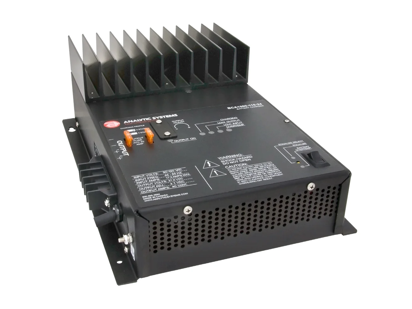 The traditional BCA1000 series chargers feature 1000 watts of precision charging power for 1 or 2 banks of batteries at 12, 24, 32, 36, 48 or 72(rail) volts DC. Models are available to operate from 110 or 220 volts AC at 50, 60 or 400 Hz.