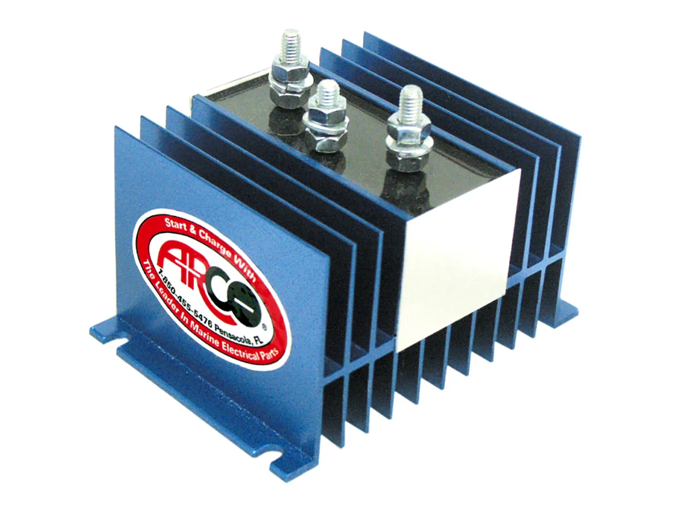 The Arco Marine BI-0702-4 is an inboard/outboard battery isolator that can handle 1 alternator, 2 batteries, and 70A max. Rated for use with 10 to 350-amp alternators on 12, 24, or 32-volt negative ground systems.