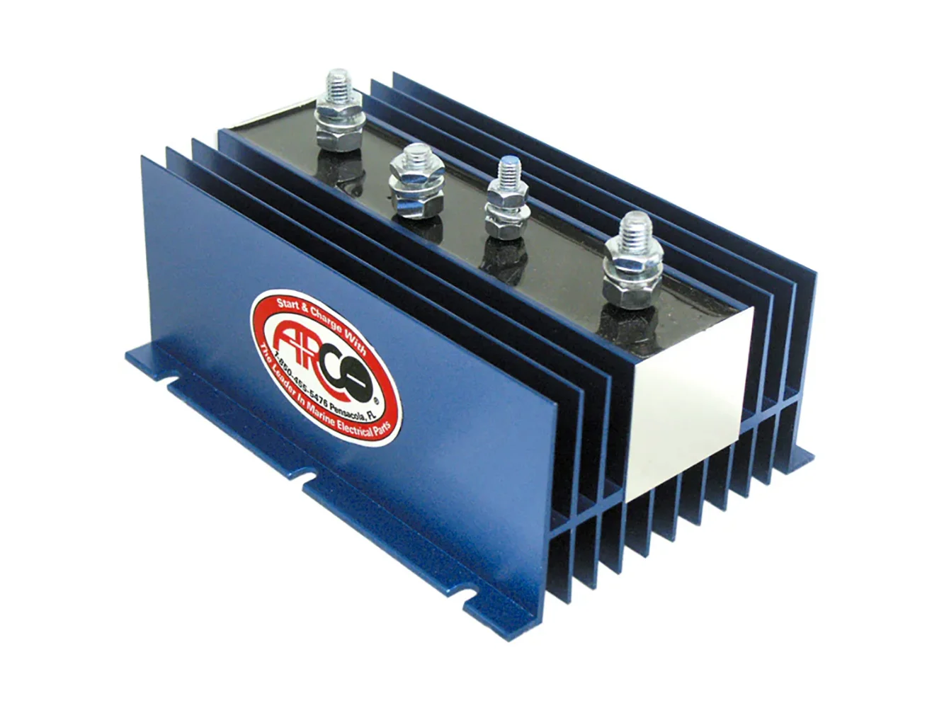 The Arco Marine BI-1203-3A is an inboard/outboard battery isolator that can handle 1 alternator, 3 batteries, and 120A max. Rated for use with 10 to 350-amp alternators on 12, 24, or 32-volt negative ground systems.