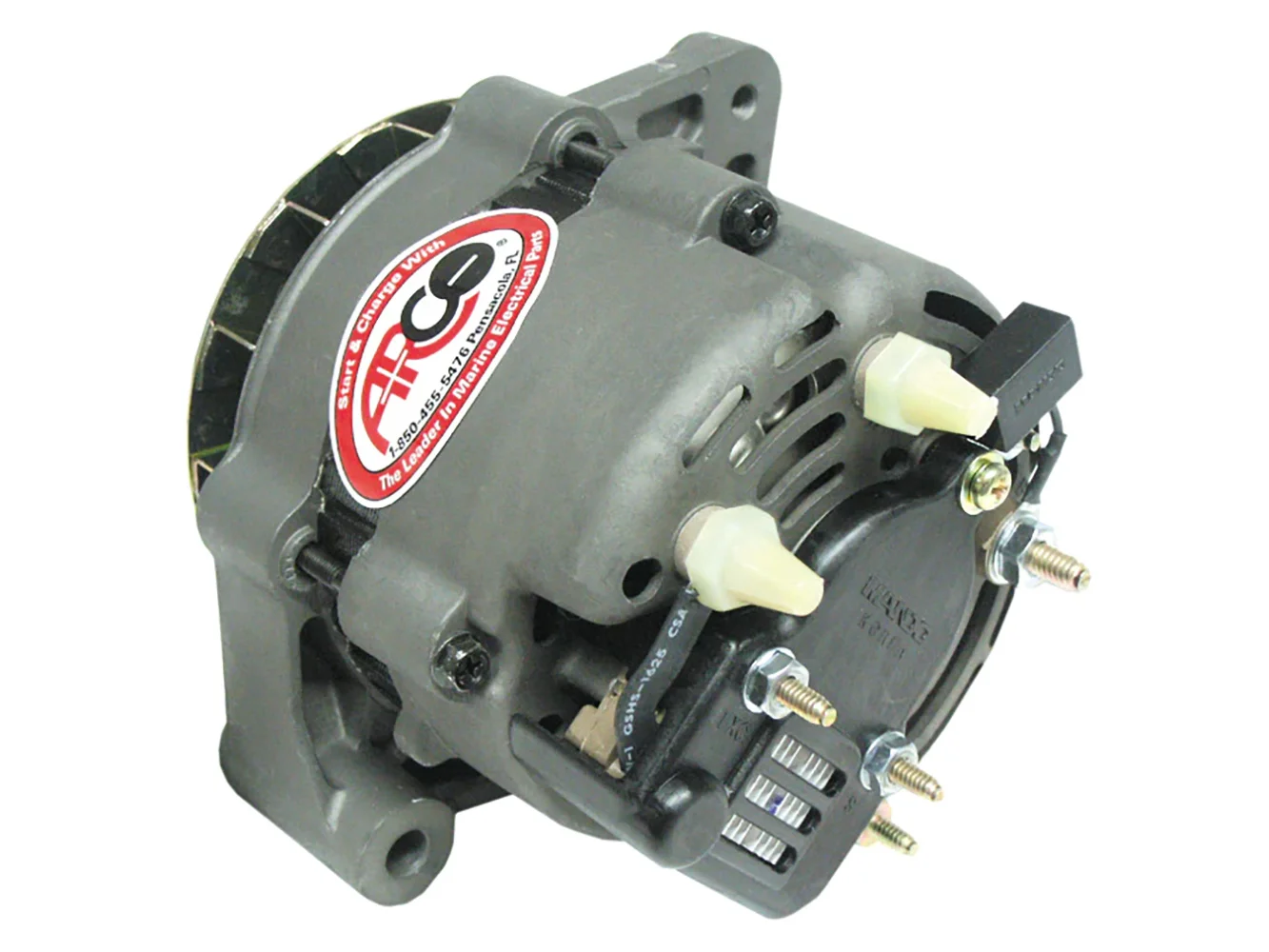 Replacement alternator that will fit O.M.C. Cobra., Prestolite/Motorola, 12 Volt, 55 Amp, Internal regulator, Negative ground, 2-inch mounting foot, Single groove pulley included.