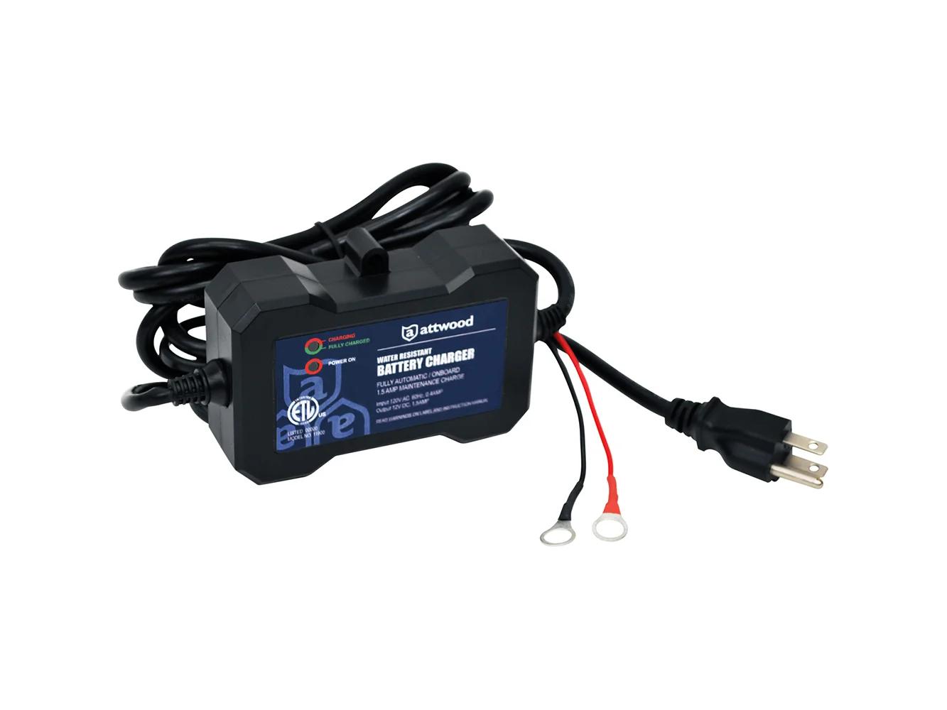Fully-automatic on-board charger provides a 1.5 Amp maintenance charge. Designed to maintain 12V batteries. Water resistant with safety features like short circuit connection and reverse polarity protection.