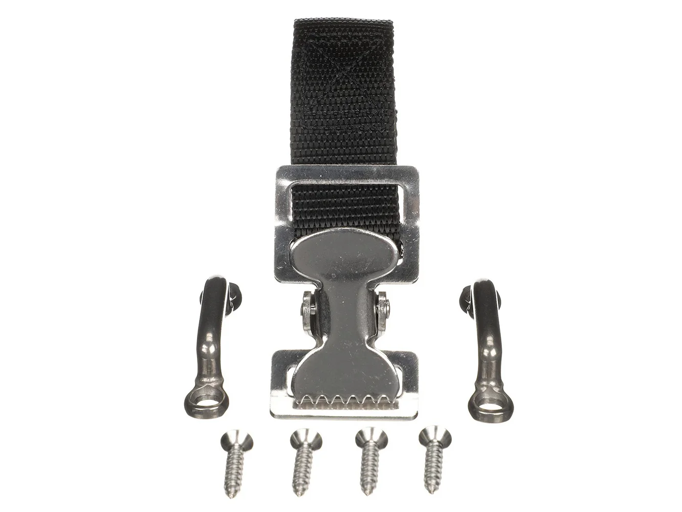 This Attwood Fuel Tank Strap Set contains everything needed to secure a 3-6-gallon fuel tank in place. This kit includes a 48-inch-long, 1-inch-wide white nylon web strap with a zinc-plated carbon steel snap and quick-release buckle. There are also 2 metal footman securing loops and the screws needed to install them. The strap can be run through the footman openings and then tightened and buckled to hold the tank in place.