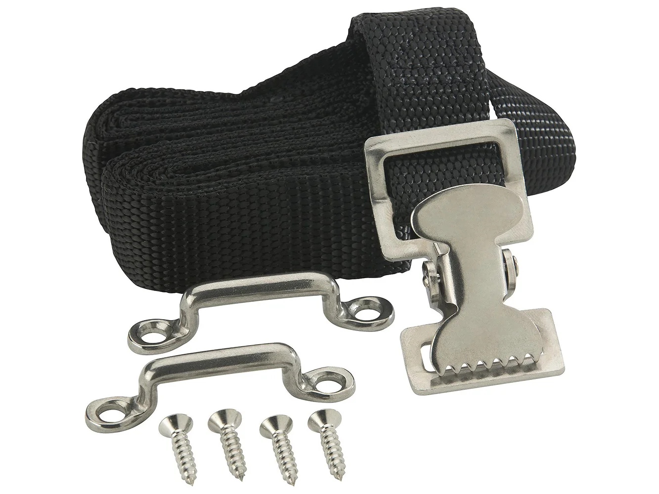 This Attwood Fuel Tank Strap Set contains everything needed to secure a 12-gallon fuel tank in place. This kit includes a 72-inch-long, 1-inch-wide white nylon web strap with a zinc-plated carbon steel snap and quick-release buckle. There are also 2 metal footman securing loops and the screws needed to install them. The strap can be run through the footman openings and then tightened and buckled to hold the tank in place.