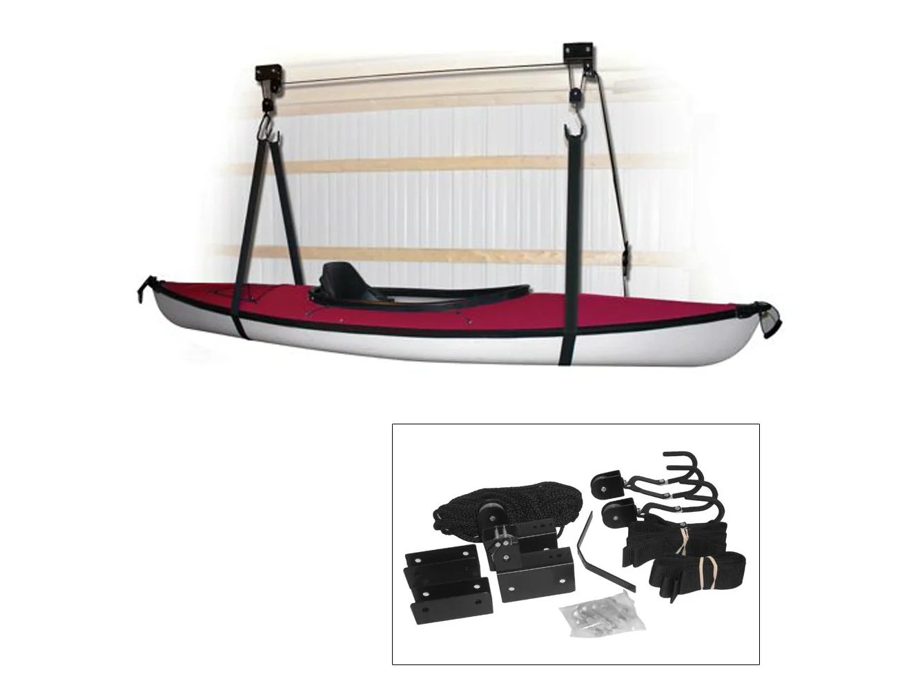 Attwood’s Kayak Lift Hoist is designed for the storage of kayaks, canoes, bikes, ladders and so much more. The pulley systems are constructed to allow one person can hoist any kayak, while the hook and locking mechanisms are able to safely hold up to 120 lbs. Features on this kayak storage hoist include an easy lifting pulley system and 2-inch wide webbing hand straps. All hardware needed for mounting this kayak hoist is included with your purchase. Place the Black Attwood Kayak Lift Hoist in your garage or storage shed, and you are set to keep your kayak up and off the ground all winter.