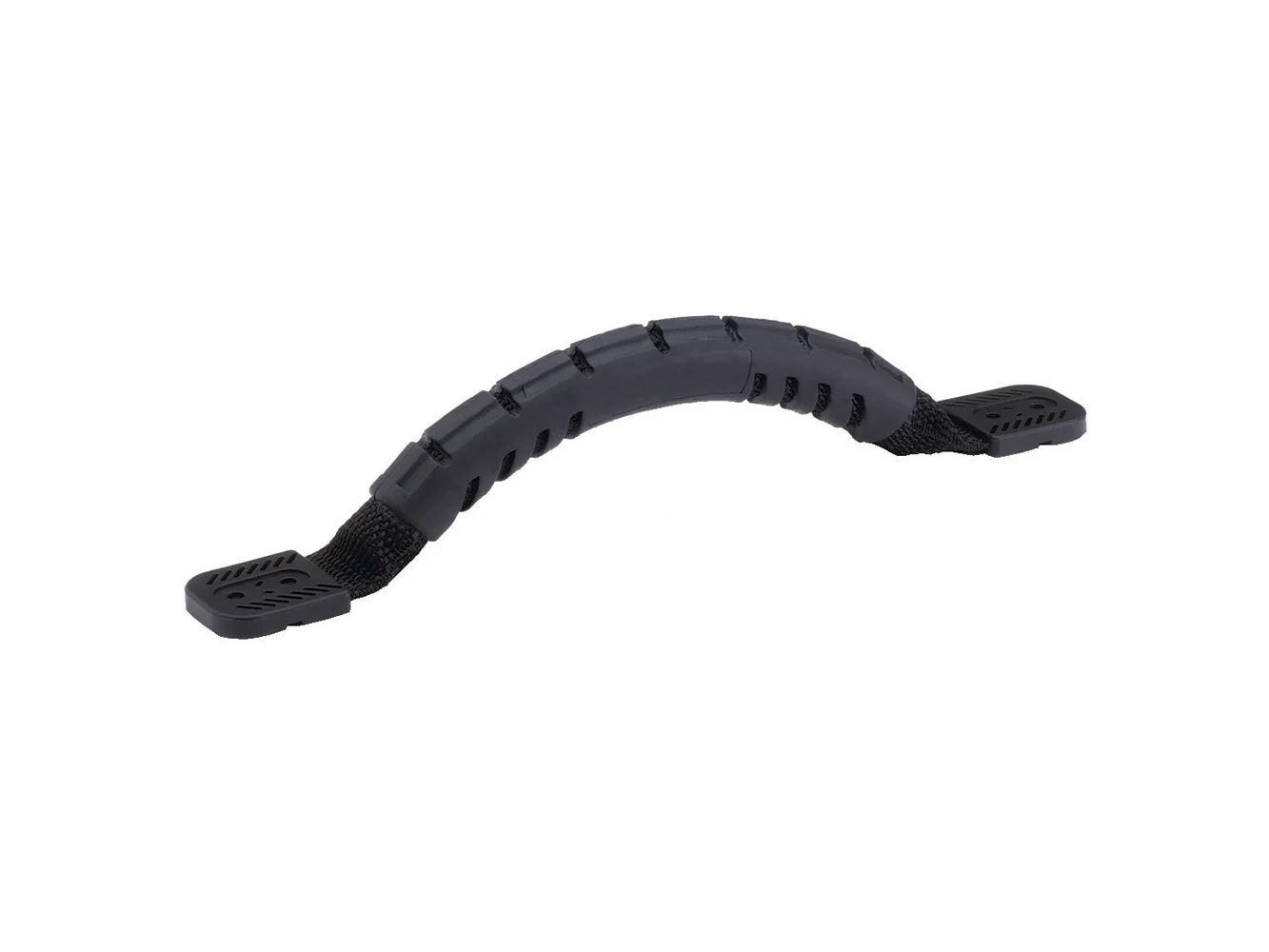 Flexible grab handle for flush, flexible mounting. Can be mounted to a variety of irregular surfaces and angles on swim platform, in the cockpit and companionway. Constructed from soft polypropylene webbing over a semi-rigid core. Because of the soft, pliable webbing in these handles and the absence of any sharp edges, they are safe in areas where occupants might come in contact with them.
