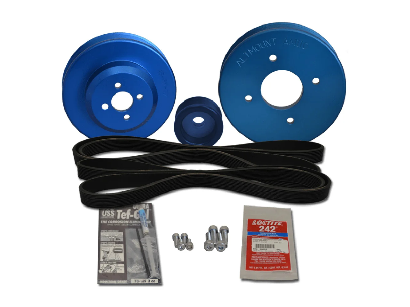 Kit Includes: Three Ten-Groove (J10) Pulleys, Two J10, 45″ Circumference Serpentine Belts (one spare) & Mounting Hardware