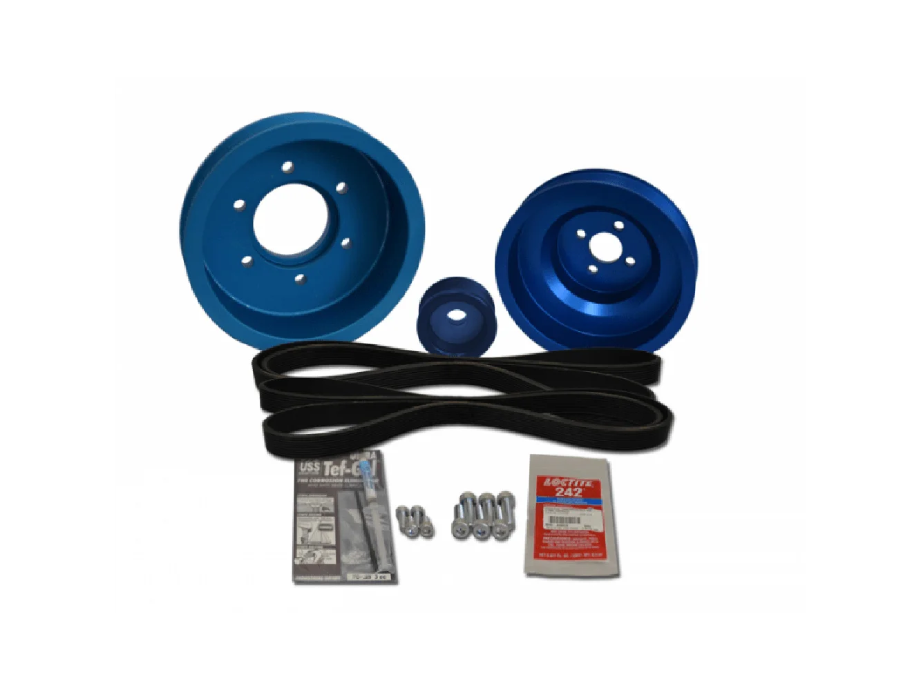 Kit Includes: Three Ten-Groove (J10) Pulleys, Two J10, 48″ Circumference Serpentine Belts (one spare) & Mounting Hardware