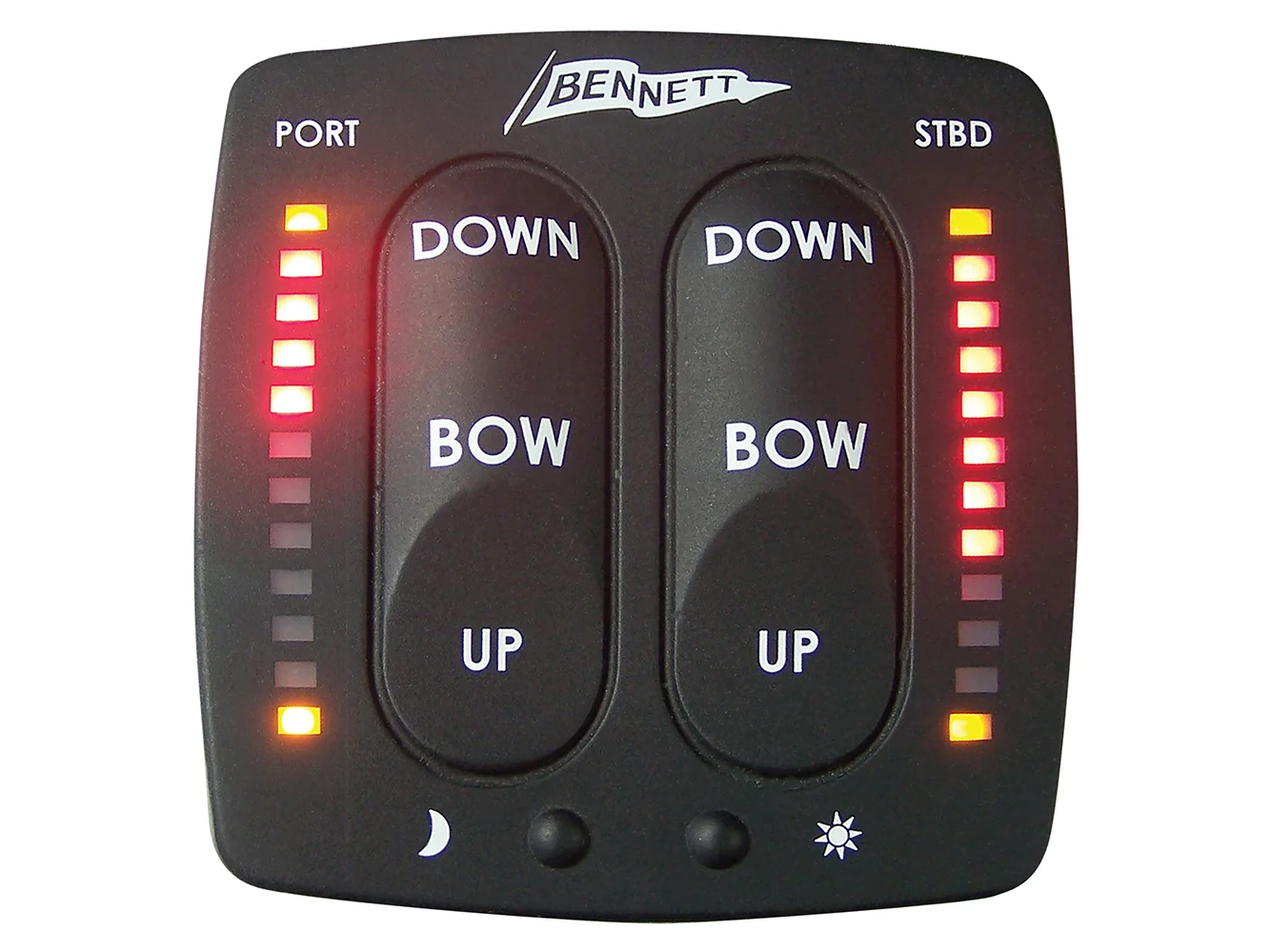 This Bennett control display is a display only and has three features combined into one sophisticated control: soft-touch helm control, trim tab indicator, and the auto tab retractor feature.
