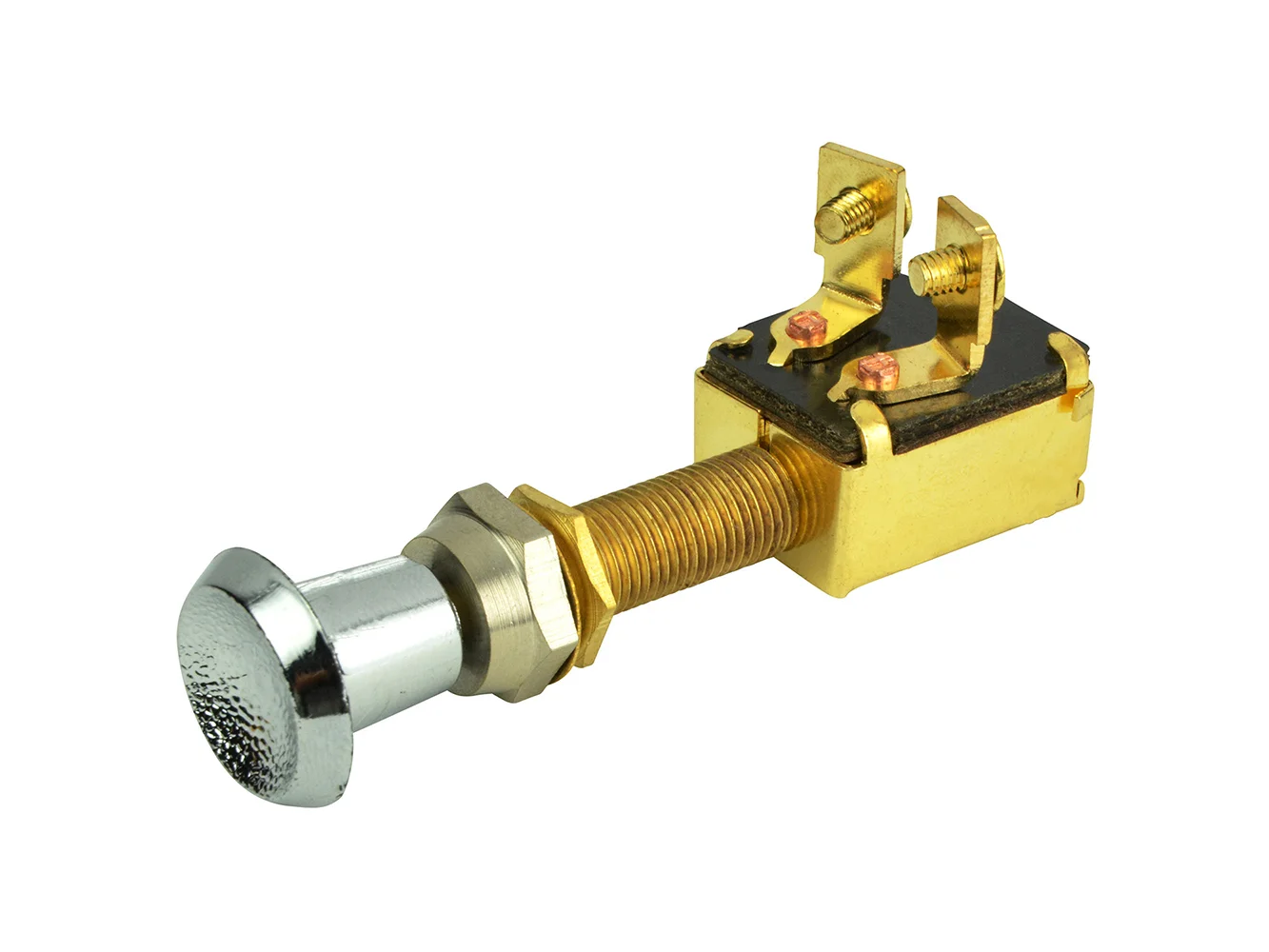 Single pole, single throw switch turns one circuit on and off. Heavy-duty, noncorrosive construction with moisture-repellent insulators. Brass case, stem, terminals and mounting hardware. All knobs are screw-on type.