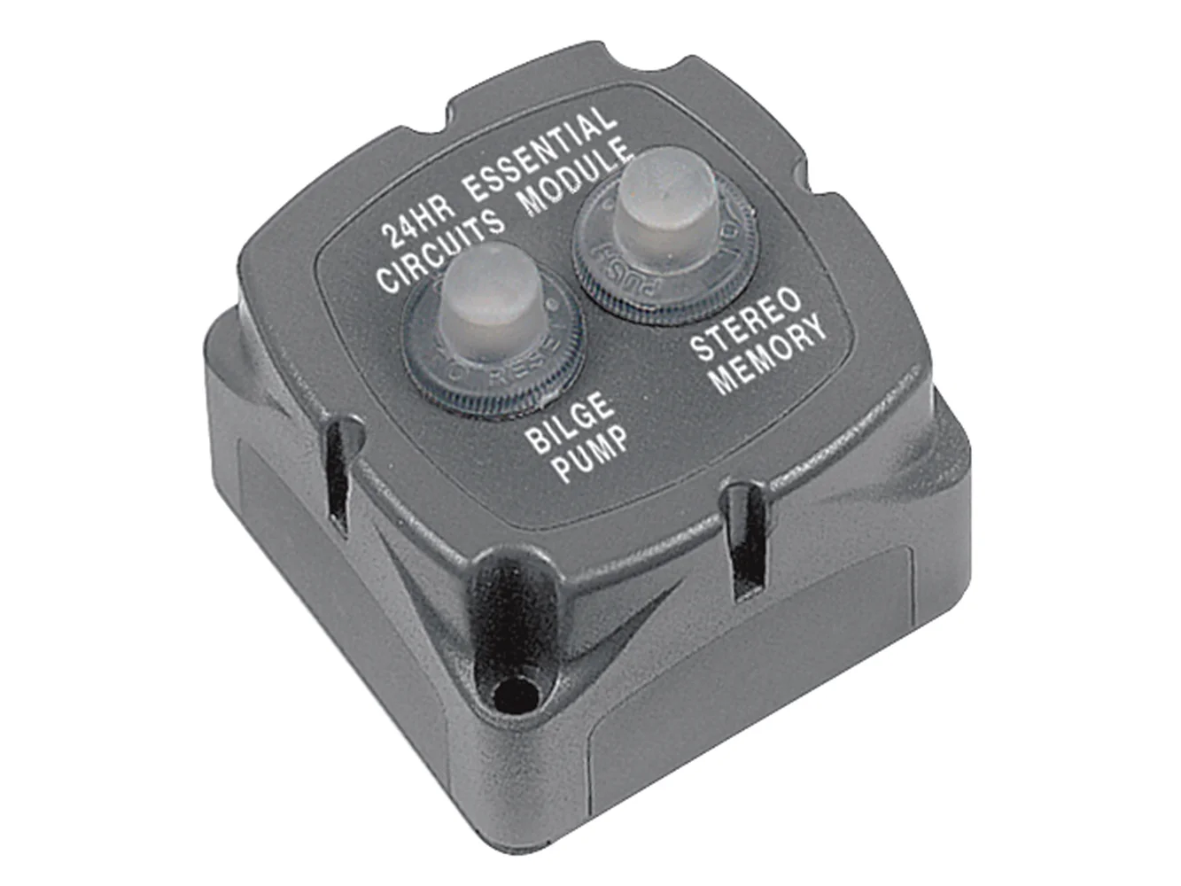 The 706-2W 24 hour essential circuit module is suitable for essential circuits such as bilge pump auto float switch supplies and stereo memory circuits. The push to reset function ensures essential 24hr circuits cannot be switched off inadvertently. This is contained in the contour lock single module.