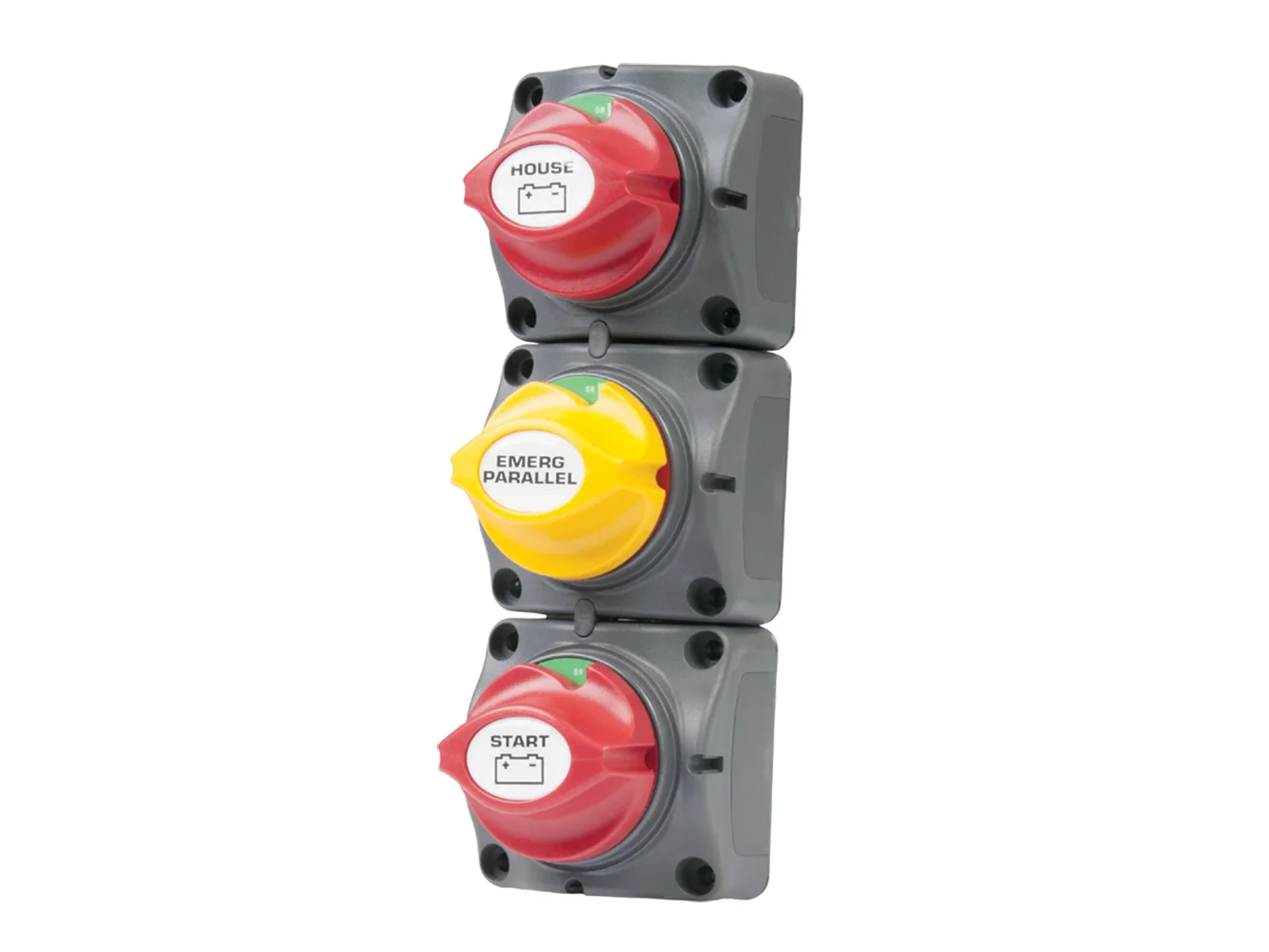 Vertical unit to be used in single outboard with a dual battery bank, single alternator with a dual battery bank, or in a twin alternator with a dual battery bank.