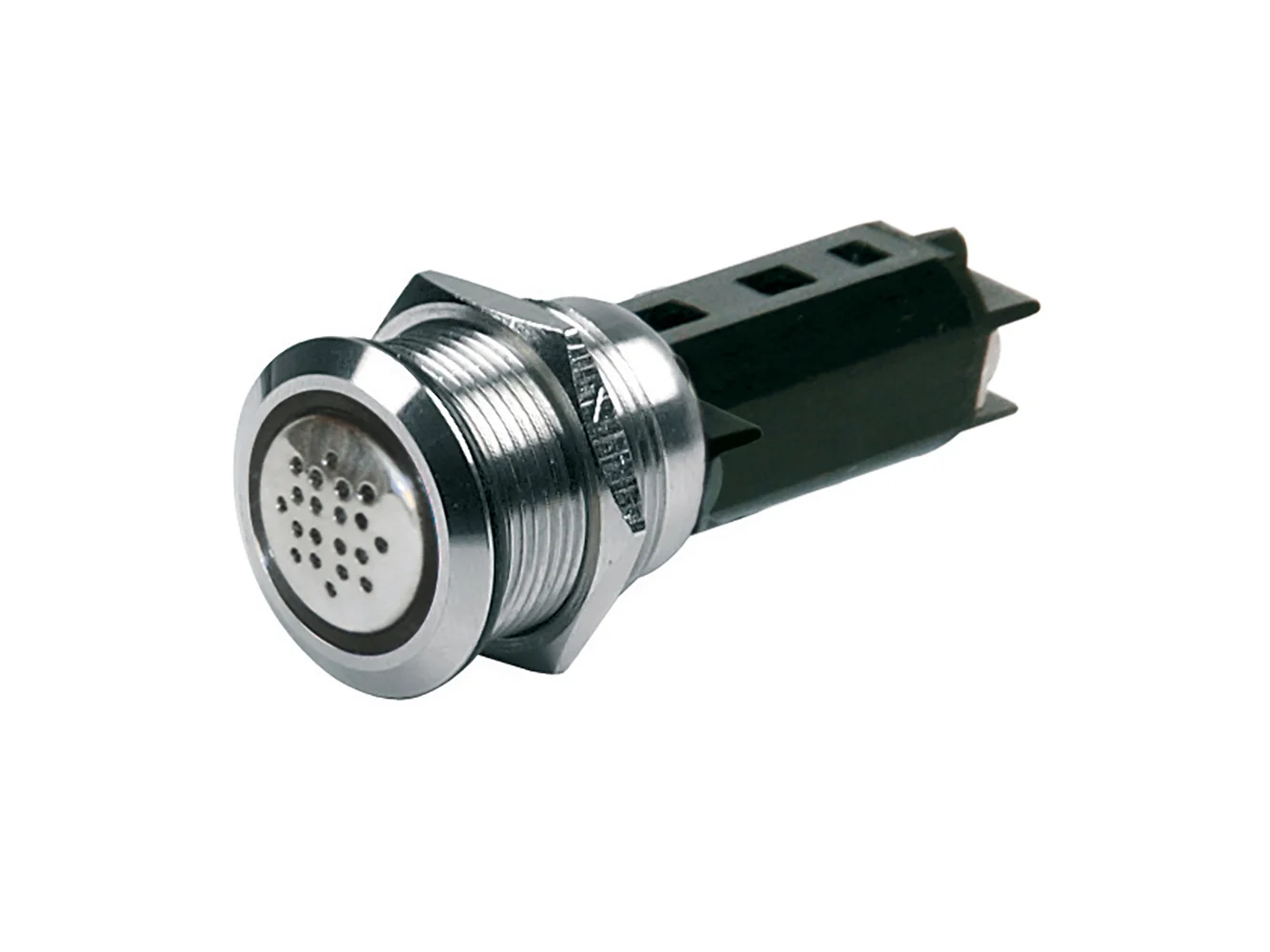 Push-Button switches and buzzers are built to last with their stainless steel components and silver alloy contacts. The through panel mount switches are ideal for lighting, switch, or dash panels, with colored rings that can be wired to either display power to the system or switch back lighting. The product line includes both switches and warning buzzers.