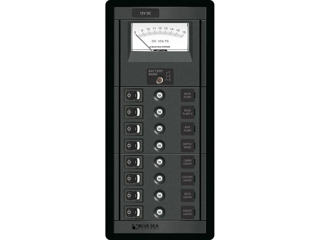 - Panels with meters include a toggle switch to monitor voltage on up to three battery banks