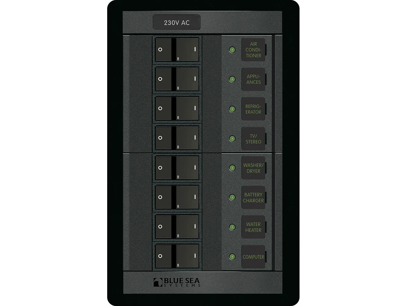 This 360 Panel System consists of modules. Each module contains a meter, a battery switch, and 8 circuit-labeled positions.