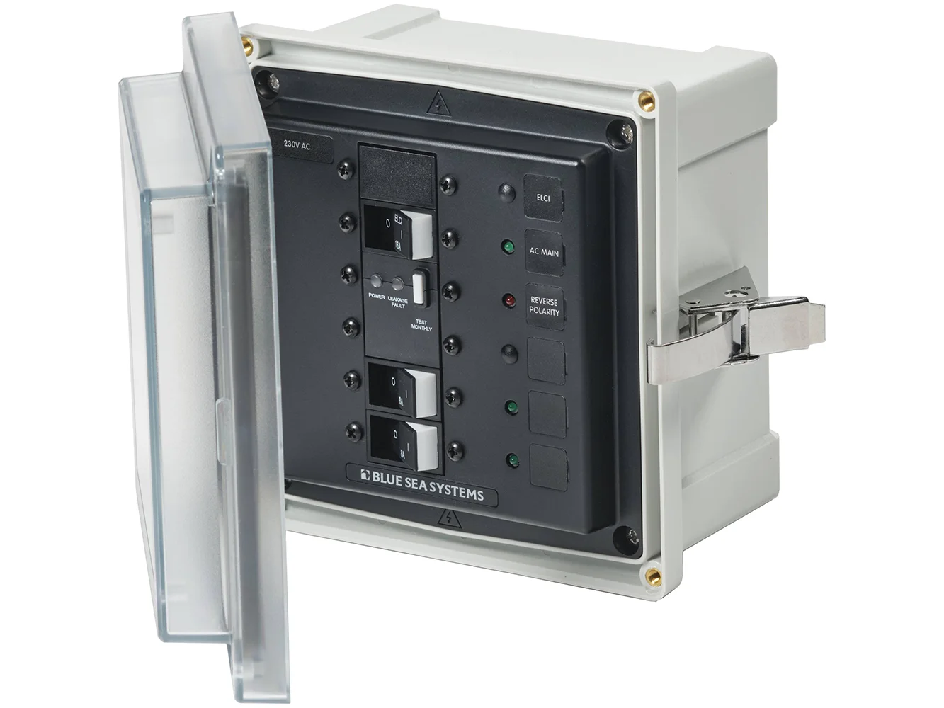 The 3122-panel enclosure is built for Equipment Leakage Circuit Interrupters (ELCI) main circuit breakers and other large frame devices. Meets ABYC E-11 when used with an ELCI Main circuit breaker and mounted within 10′ of AC shore power inlet.