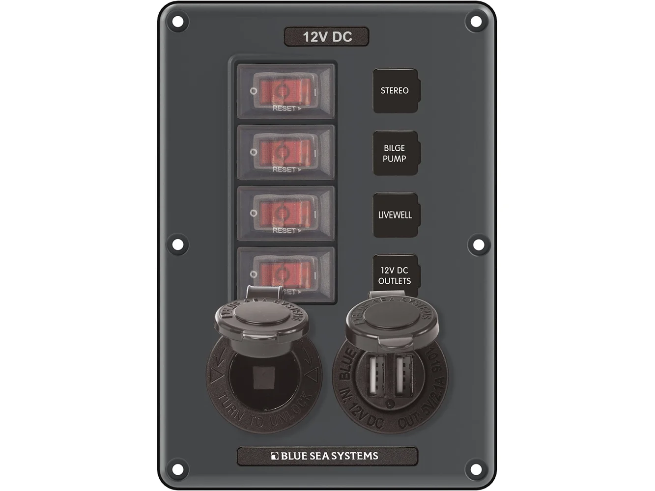 4321 Circuit Breaker Switch Panel 4 Position – Gray with 12V Socket & Dual USB