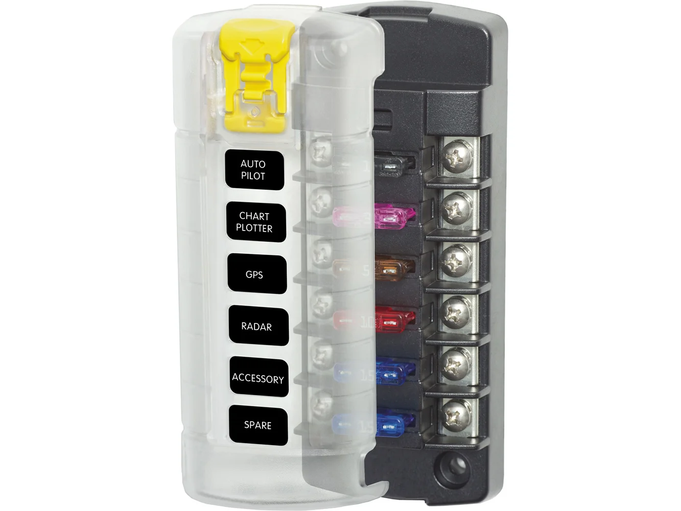 - Cover satisfies ABYC/USCG requirements for insulation, incorporates an easy to open push button latch providing easy access to fuses, storage for two spare fuses, and label recesses that accept Blue Sea Systems’ Small Format Labels for circuit identification