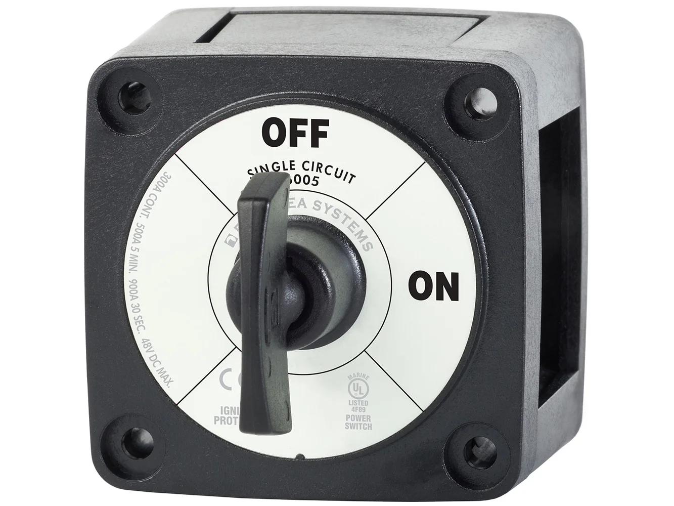 Switches a single battery to a single load group Ignition protected-safe for installation aboard gasoline powered boats.