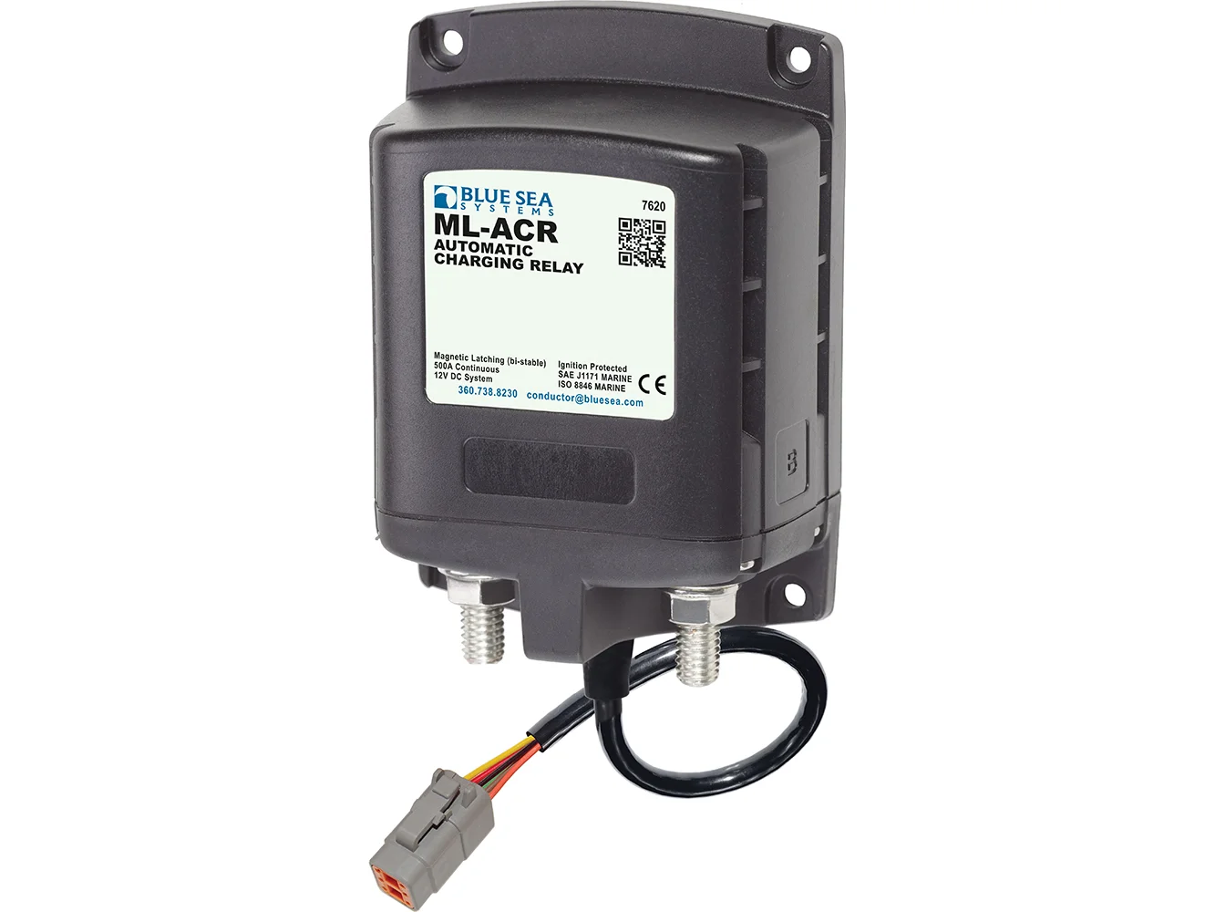 500 Amp magnetic latching (bi-stable) relay automatically combines batteries during charging and isolates batteries when discharging and when starting engine.