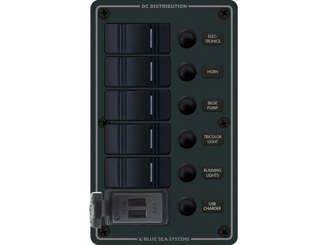 8521 – 5 Position Contura Switch Panel with Dual USB Chargers – 12/24V DC – Black