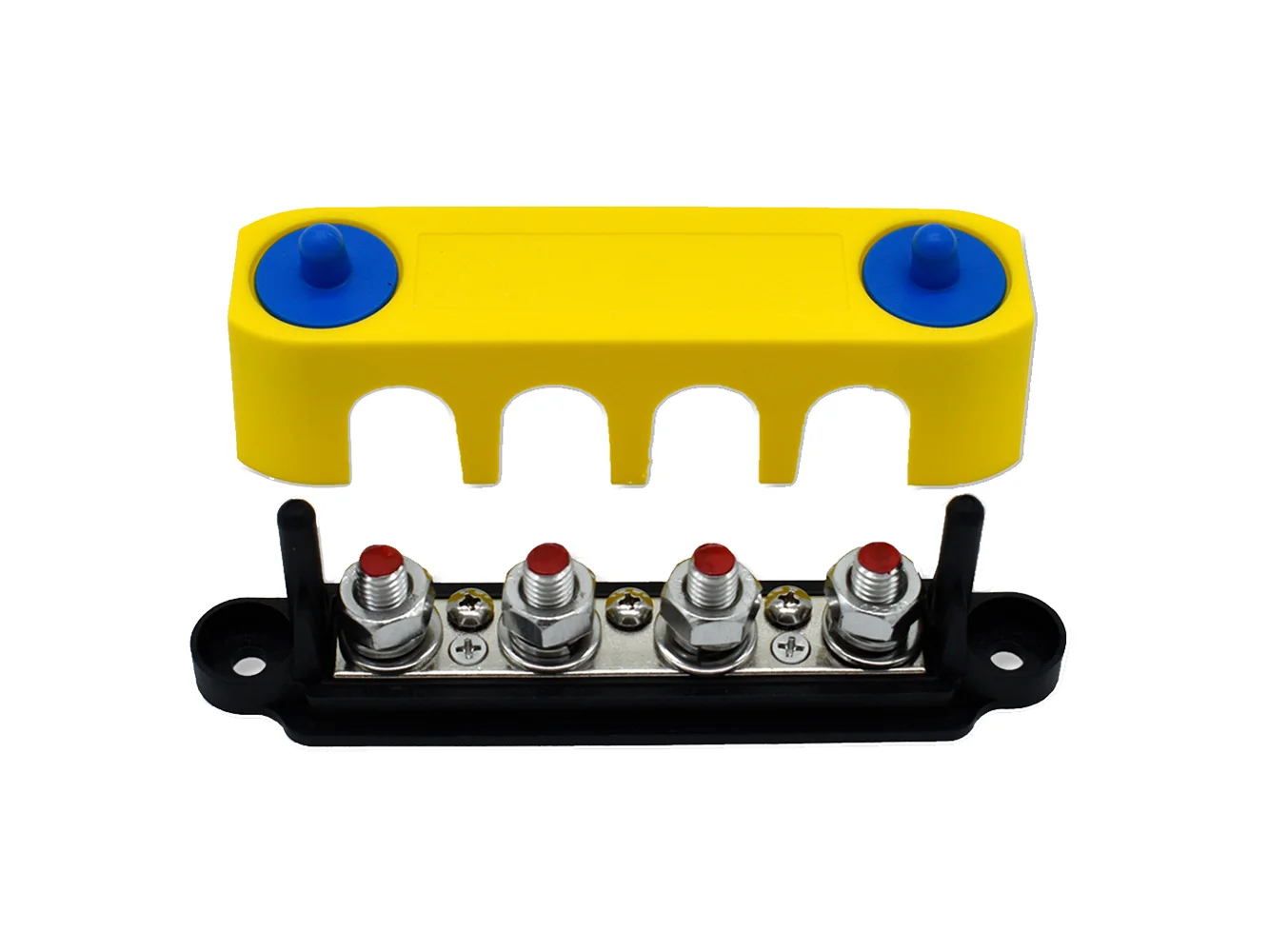 This 4-gang positive terminal block features a common stud for shared power input. This Positive Terminal Busbar is perfect for distributing power from a single source to multiple outputs, with clear labeling for safe and simple wiring.