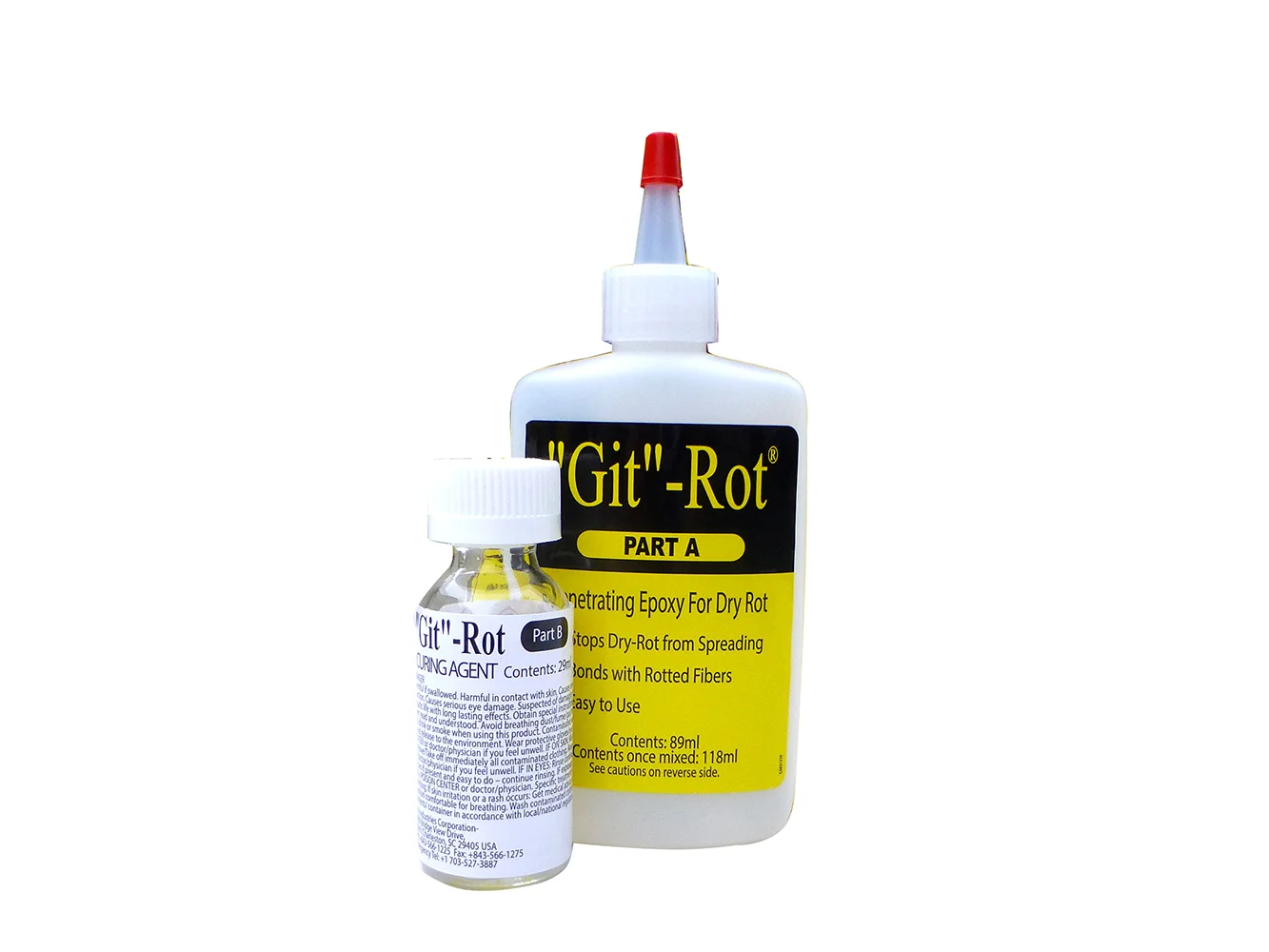 Unique two-part liquid epoxy saturates and restores original strength to wood by penetrating the rot. Actually works with the loose rotted fibers. Wood must be dry. Apply by injecting into wood. Will soak into wood by capillary action. One-half hour pot life after mixing. Cures overnight. Sandable and paintable, can be drilled and screwed. Compatible with fiberglass resins, epoxies and most sealants. Great for transoms, stringers and cabin roof rot in both fiberglass and wood boats.