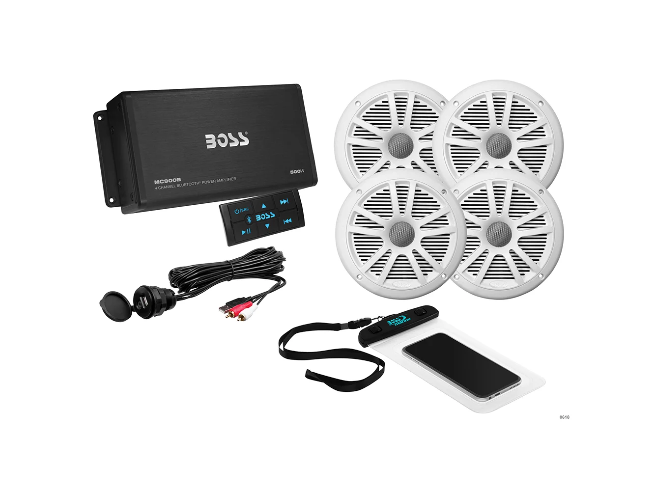This kit packs a punch with the MC900B 4-Channel amplifier w/multi-function controller, a two (2) pairs of 6.5" MR6W speakers, waterproof pouch and a USB/Aux accessory extension cable.