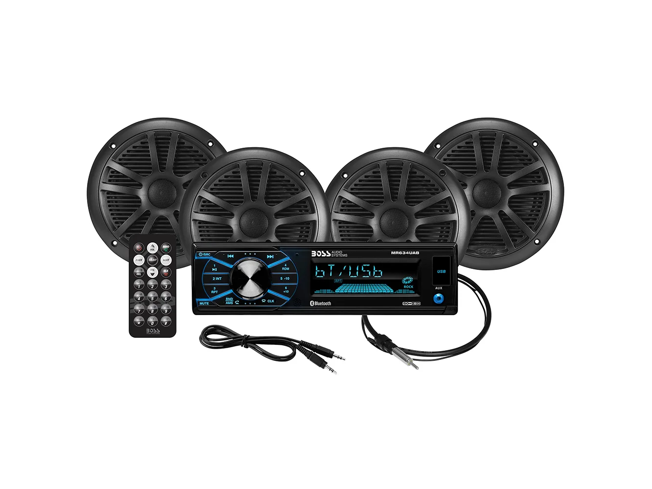 This kit makes it easy to bring music to the marine environment. The included products are built to withstand the harsh environment and include an MR634UAB radio, four MR6B speakers, an MRANT10 black antenna, and a black wireless remote.