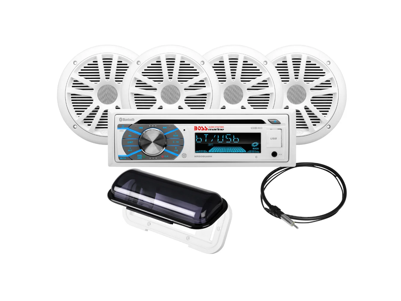 This stereo/speaker combo package from Boss is a great way to upgrade the audio on your boat, RV or ATV without emptying your wallet. The all-weather stereo features built-in Bluetooth, so you can stream your favorite tunes without taking your phone out of your pocket. And your music will sound great on the 6-1/2" marine-rated speakers. This package also includes a 41" dipole antenna, radio cover and mounting hardware.