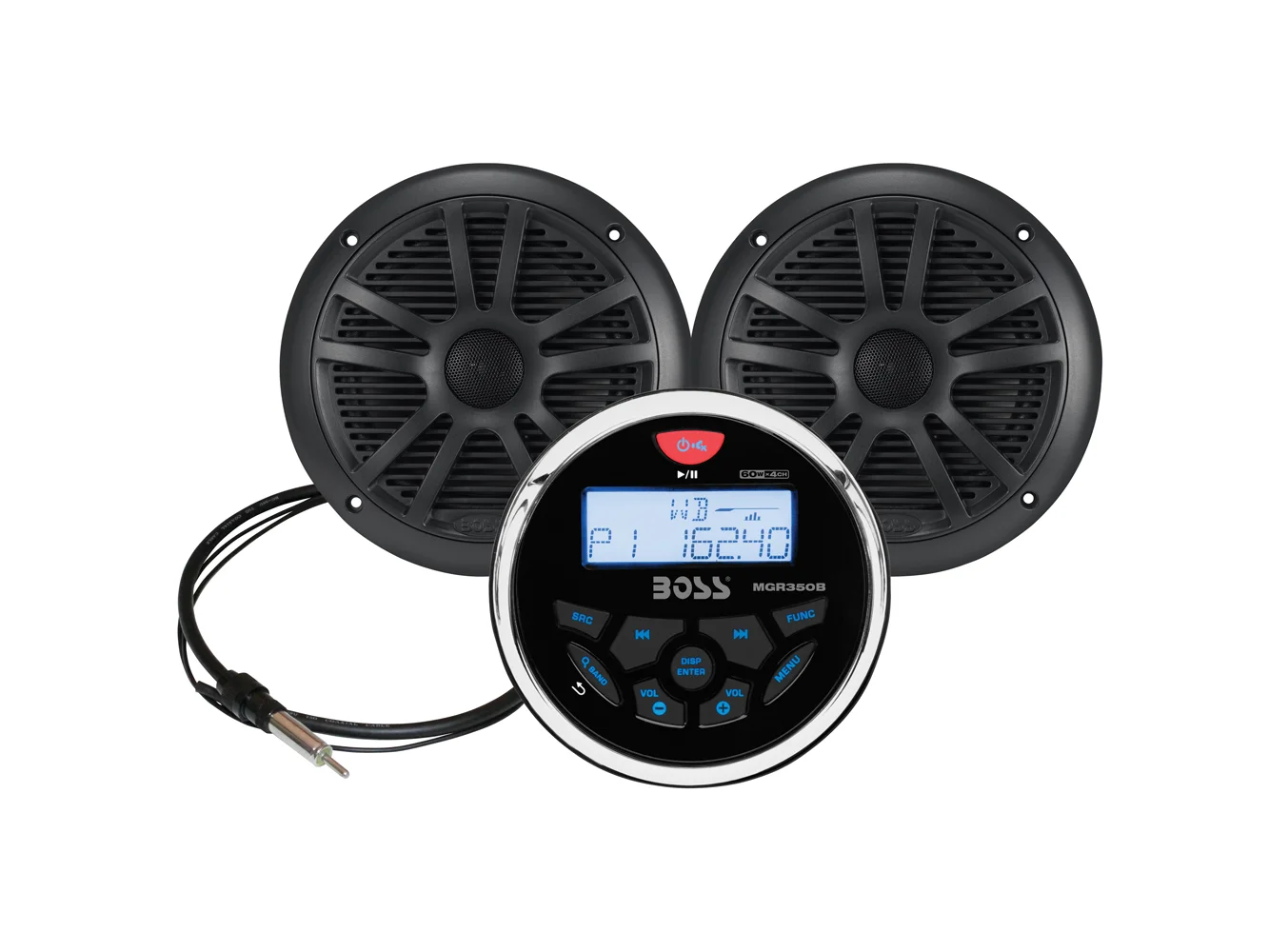 This stereo/speaker combo package from Boss is a great way to upgrade the audio on your boat, RV or ATV without emptying your wallet.  The all-weather stereo features built-in Bluetooth, so you can stream your favorite tunes without taking your phone out of your pocket.   And your music will sound great on the 6-1/2" marine-rated speakers. This package also includes a 41" dipole antenna and mounting hardware.