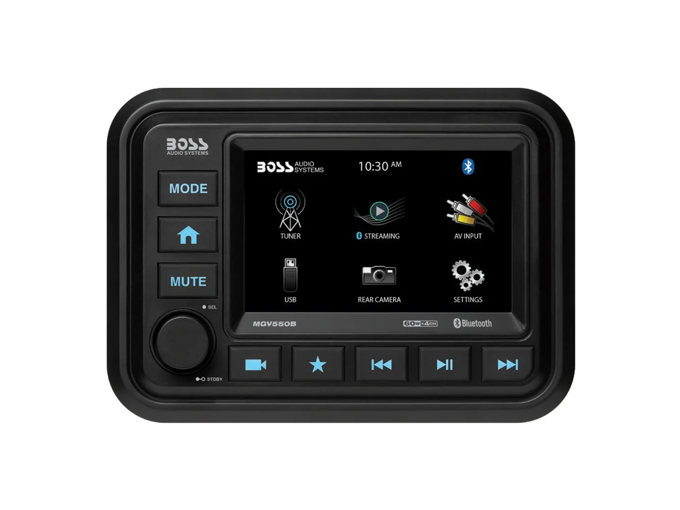 Time to upgrade your boat's audio system? The Boss MGV550B marine stereo gives you impressive sound and marine-rated reliability, so it's a great starting point. This all-weather stereo features built-in Bluetooth, so you can stream your favorite tunes without taking your phone out of your pocket.