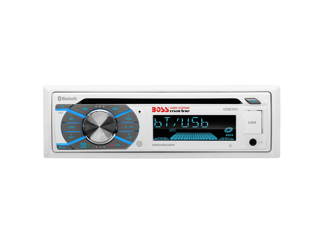 The Boss MR508UABW marine stereo is designed for marine use, with a UV-resistant exterior that resists fading and a conformal-coated PC board that resists corrosion. It blends into most boat interiors and offers an impressive list of features.