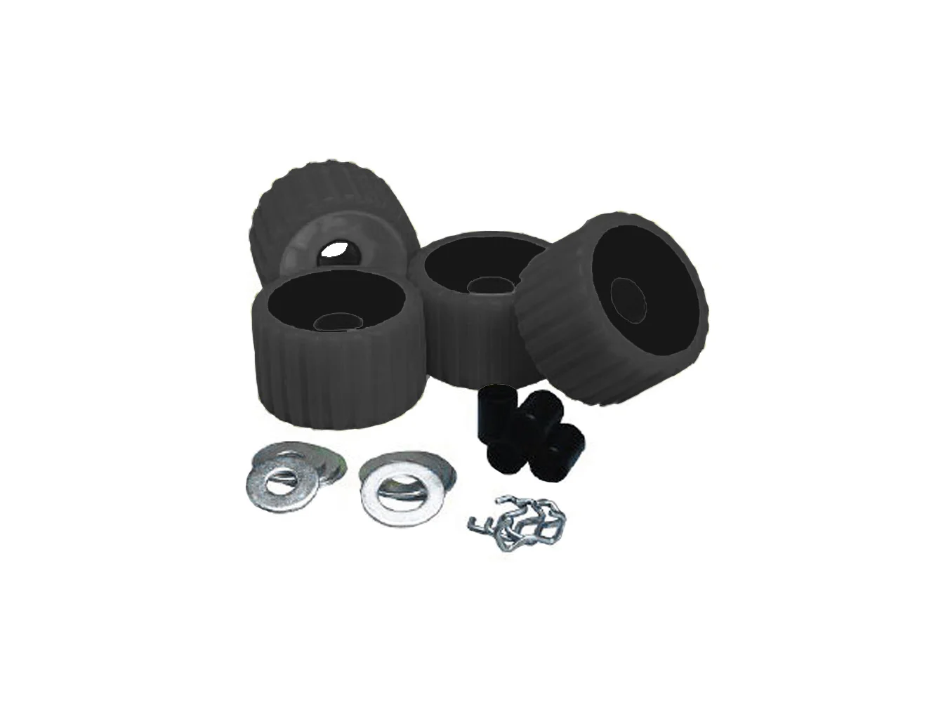 For replacement of ribbed wobble rollers. Kit includes four 5″ x 3″ black ribbed rollers, four Delrin bushings, four 1-1/8″ washers, four 3/4″ washers and four retainer rings.