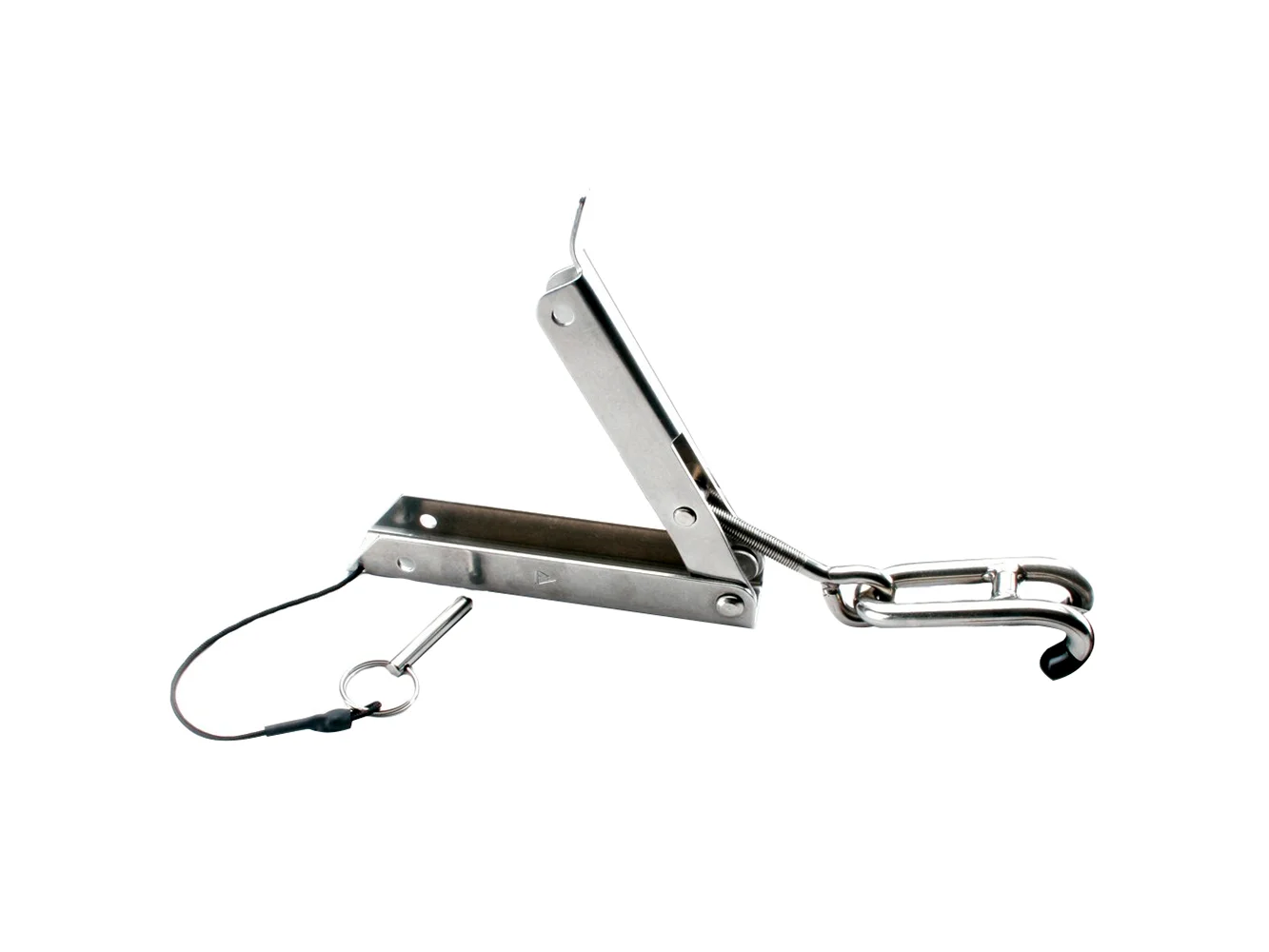The “Claw Hook” design features a shorter overall length. The claw design will grab 1/4″, 5/16″ and 3/8″ chain. The toggled claw enables you to grab the chain quickly and easily. Two 1/4″ mounting holes are provided in the base of the unit and the claw has 1-1/2″ of finite adjustment. The overall length closed is adjustable between 11″ and 13″ with a 2-1/8″ throw or quick release. The handle/lever is secured when closed with a ball type QR pin attached with a lanyard.