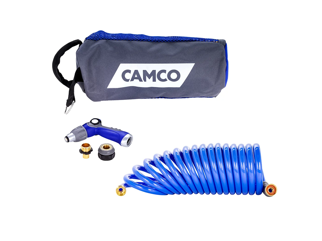 Camco’s 20-Foot Coiled Hose and Spray Nozzle Kit is a complete wash kit that is ideal for marine use, as well as general cleaning, car washing and daily gardening since they are lightweight, easy-to-use and store. The coiled hose features strain relief to help prevent kinking. Included in the kit are an adjustable spray tip nozzle with thumb lever for flow control as well as a quick connect fitting. The quick connect fitting allows the hose to easily attach/detach from the spray tip nozzle as well as allow the nozzle to swivel a full 360-degrees.
