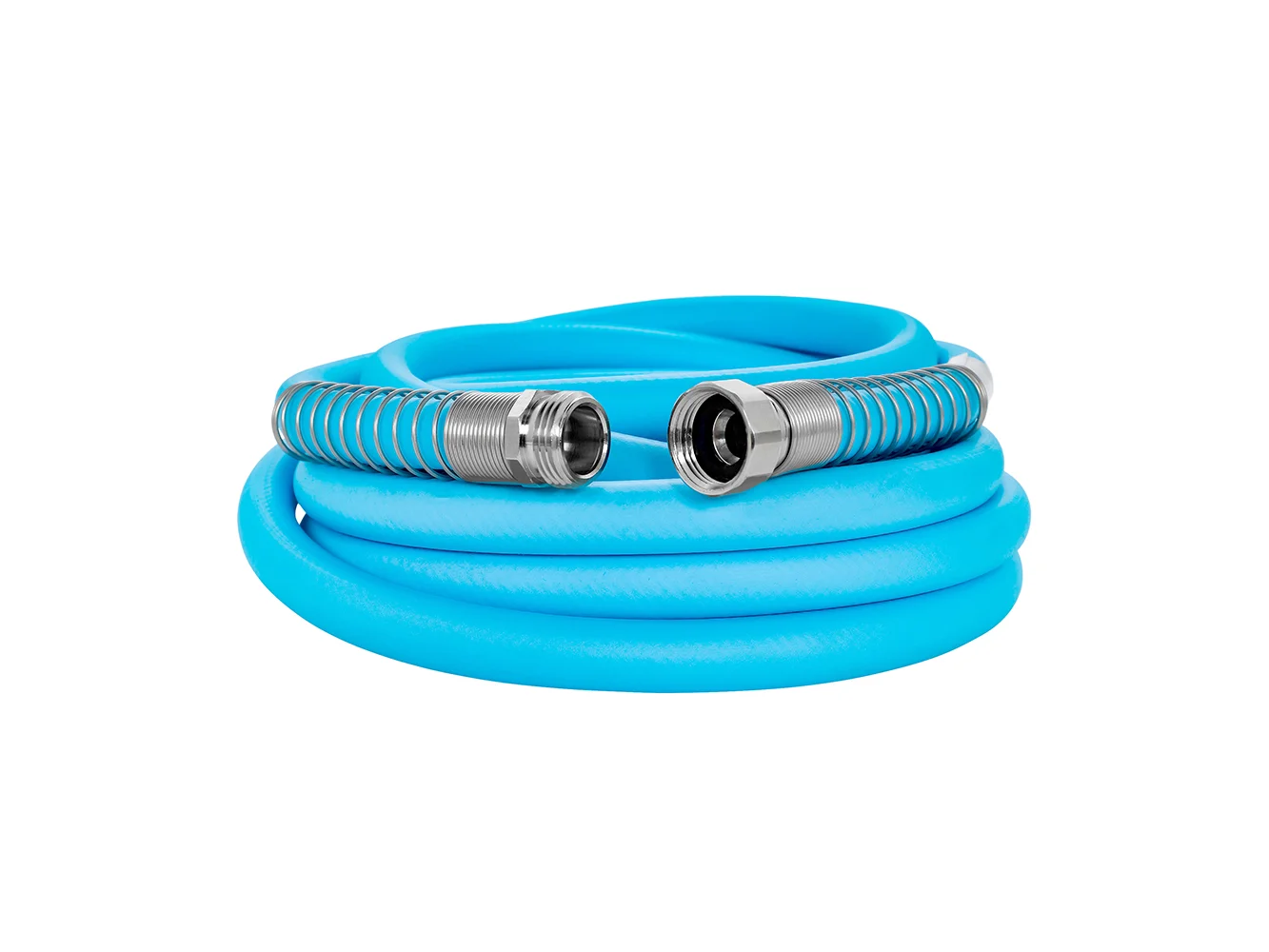 Camco’s Evo Flex 25-Foot Drinking Water Hose with 5/8-inch ID is ideal for RV and marine use. Its extra flexible construction holds no memory, making it easier to position and store. Features nickel-plated machined fittings. Drinking water safe with a lead-free, BPA-free and phthalate-free formulation. The hose leaves no strong plastic taste in your water. UV-stabilized for a long life. Made in the USA.