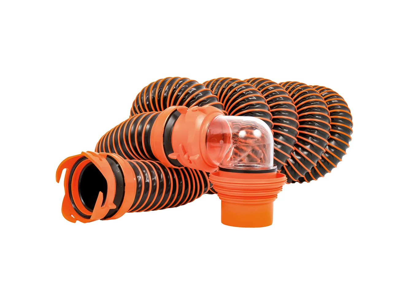 Camco’s RV Rhino EXTREME 15′ Sewer Hose Kit has all of the features that Rivers are looking for in a sewer hose. The Rhino EXTREME hose will not dent or rust and will not crush if accidentally stepped on. The sewer hose offers superior abrasion resistance for maximum protection against pinholes and leaks. The 15′ kit comes with pre-attached Rhino swivel fittings, snap-glue fittings, and storage caps. The hose has been successfully tested down to -40 degrees Fahrenheit. The removable 4-in-1 adapter allows you to store in 4” square bumpers.