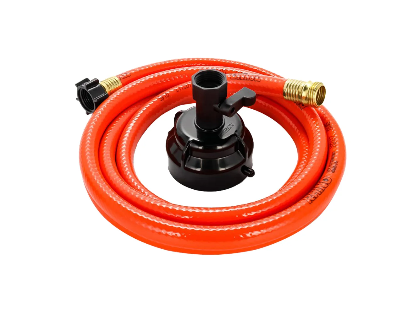 The Camco RhinoFlex 10-Foot RV Clean Out Hose with Rinser Cap allows users to rinse the sewer hose after dumping it for more sanitary storage. The Hose Rinser Cap attaches to any 3-inch bayonet fitting and creates a watertight seal. It features a 4-way water pressure blaster for better cleaning, a water shut-off valve, and four ergonomic wings for easy installation and removal. The Rhino grey water hose is bright orange, so it doesn’t get mixed up with drinking water hoses. The kit includes a rinser cap and a 10-foot hose.