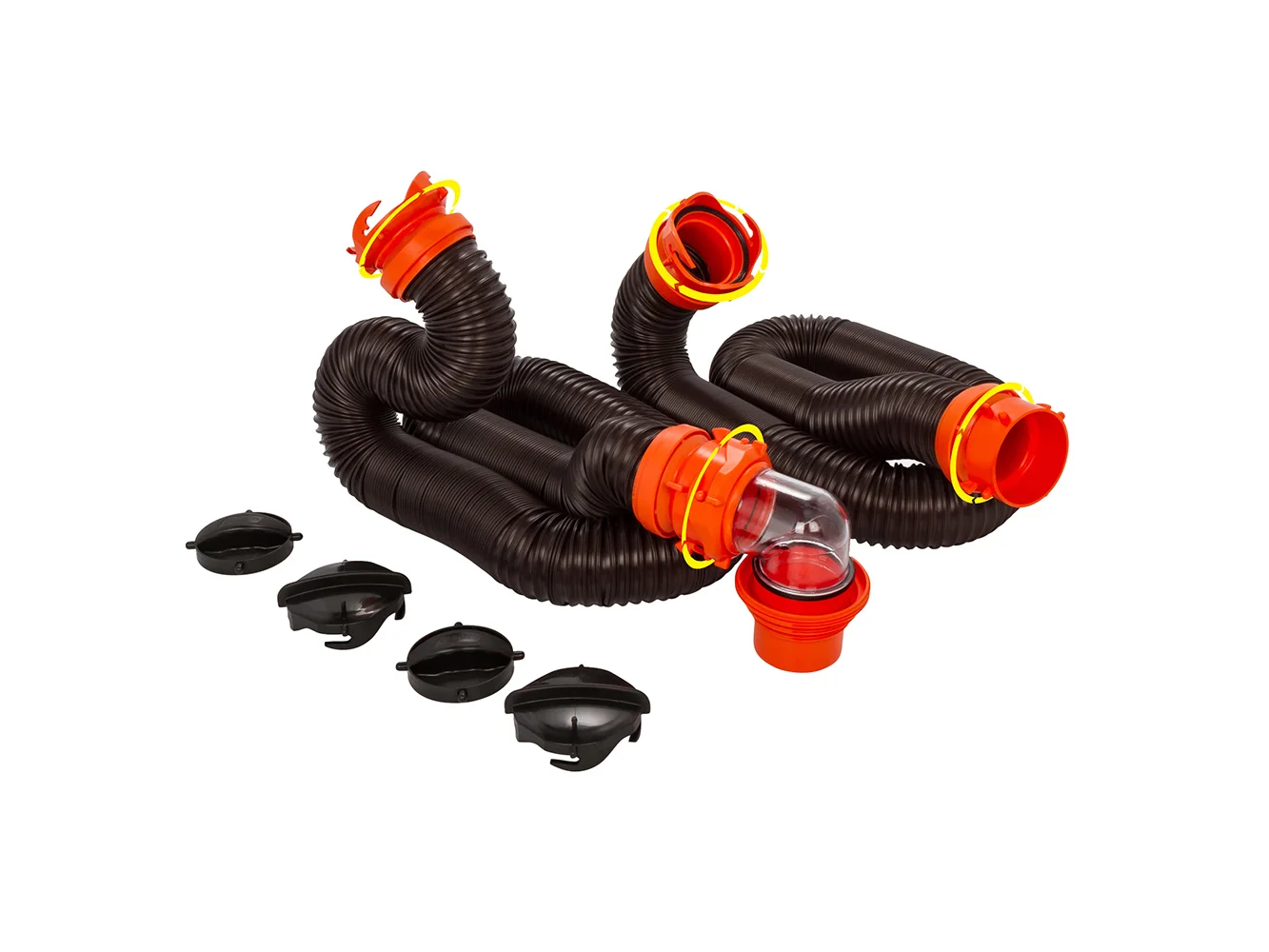 Camco’s RhinoFLEX 20-foot RV Sewer Hose Kit with RhinoFLEX hose and swivel fittings is a Ready-to-Use kit made with the toughest hose you can buy. The two hoses are made of sturdy polyolefin and are reinforced with steel wire. They are collapsible, and you only have to extend as much hose as you need. This kit features bayonet fittings with four prongs for a more secure fit. The fittings are permanently attached to the hose for a no-leak experience. Included is a transparent elbow with an easily detachable 4-in-1 adapter for connecting to a 3-inch slip or 3-inch, 3-1/2-inch, and 4-inch NPT threaded sewer connection. The kit also includes a storage cap for each sewer hose end. The hose assemblies compress for storage, and once the 4-in-1 adapter is removed you can store the hose in standard 4-inch square bumpers.