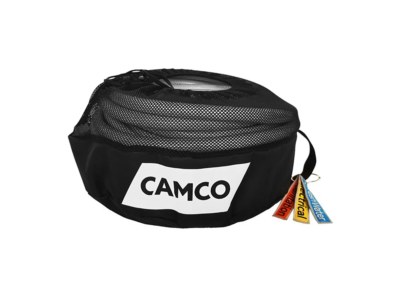 Camco’s RV Equipment Storage Bag compactly stores fresh water drinking hoses, gray water hoses, or electrical cords. It comes with (3) convenient identification tags for organizations: (1) freshwater tag, (1) electrical tag, and (1) sanitation tag.