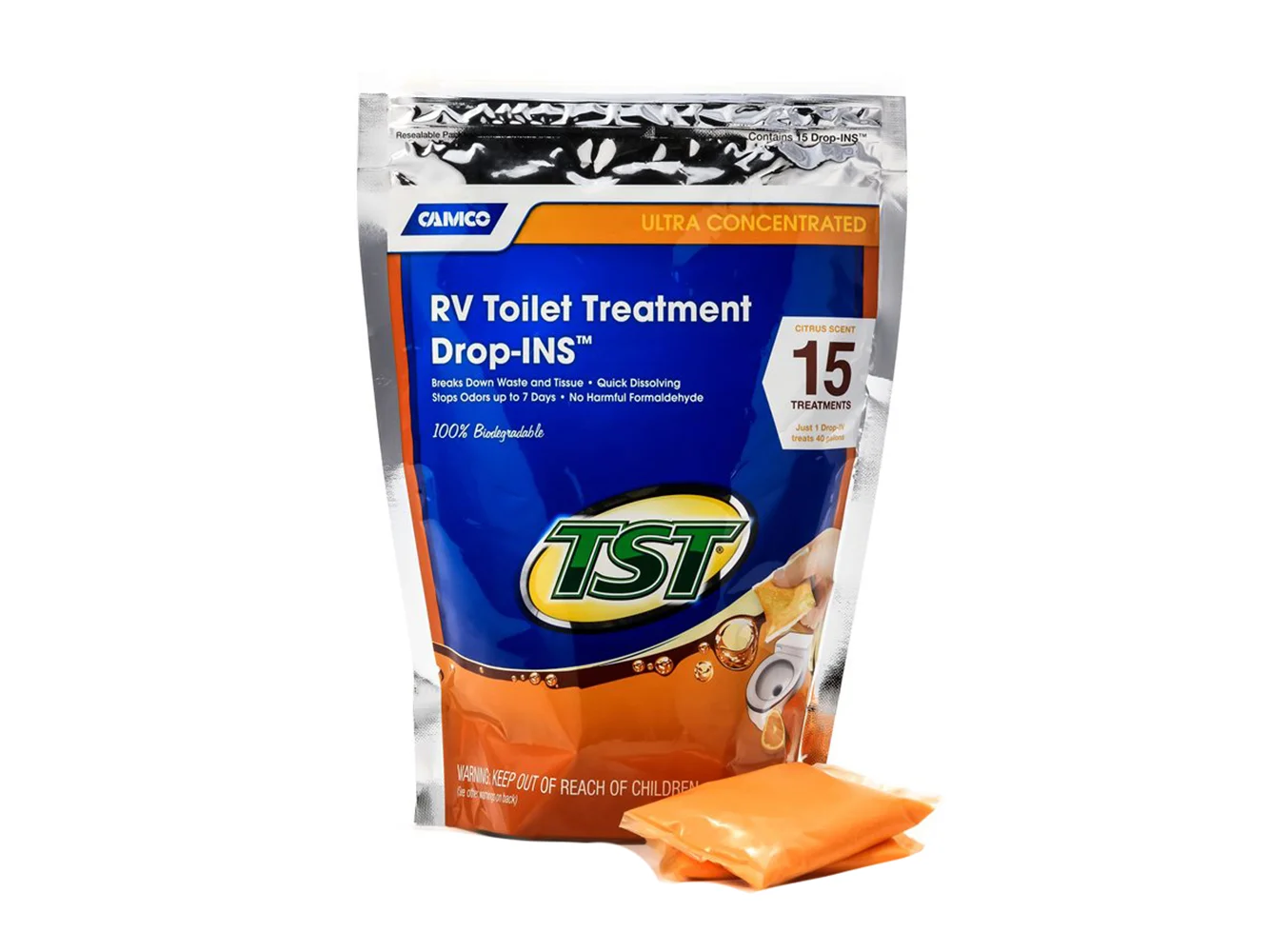 The Camco TST 12 oz. Orange Drop-ins are an effective and environmentally safe way to treat your RV’s septic system. Simply drop one unit down the RV’s toilet to stop odors and treat the water tank.
