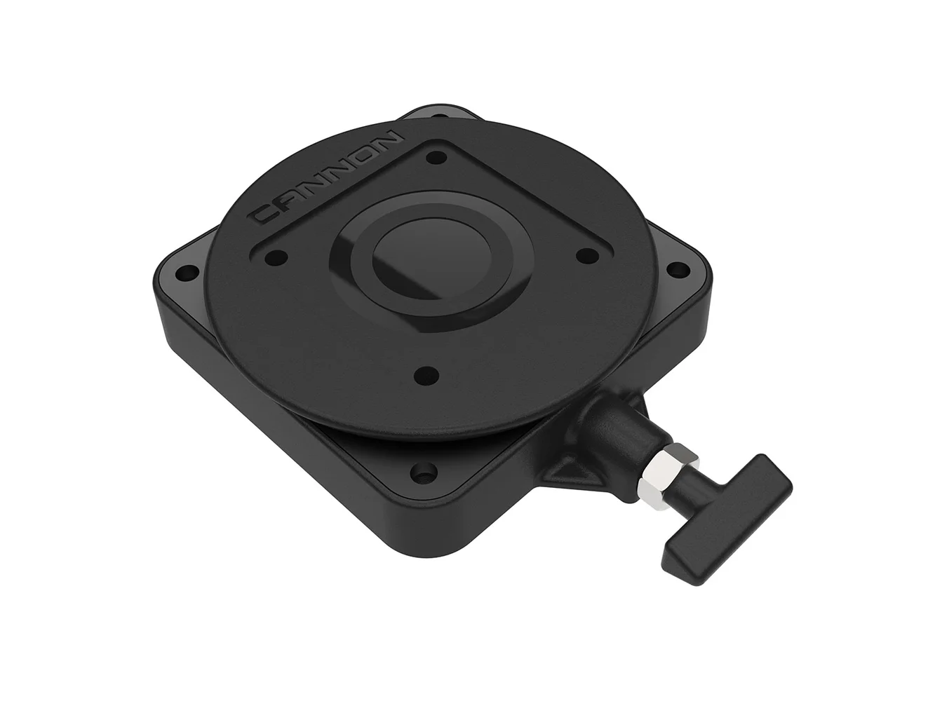 Heavy-duty Lexan® and stainless steel swivel base. 1 1/8" tall. Six-point locking including two 45-degree positions. Measures 5" x 5" x 1 1/8". For all Cannon downriggers. Includes four 1/4" – 20 x 1 truss head screws