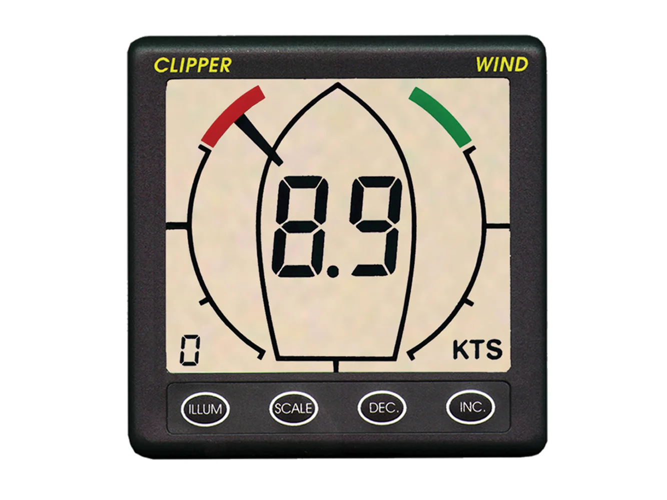 The Clipper Wind system shares the same 110mm square case as its sister instruments in the Clipper range. the display is exceptionally large and clear, with 60 segments for full 360 degree direction indication. Windspeed is shown in knots, M.P.H. or Metres/second. The pointer style is selectable, from the single segment shown above, to multi segments for greater clarity or a 'windex' style indicator. The Masthead unit is well proven and supplied with 20 metres of cable as standard.