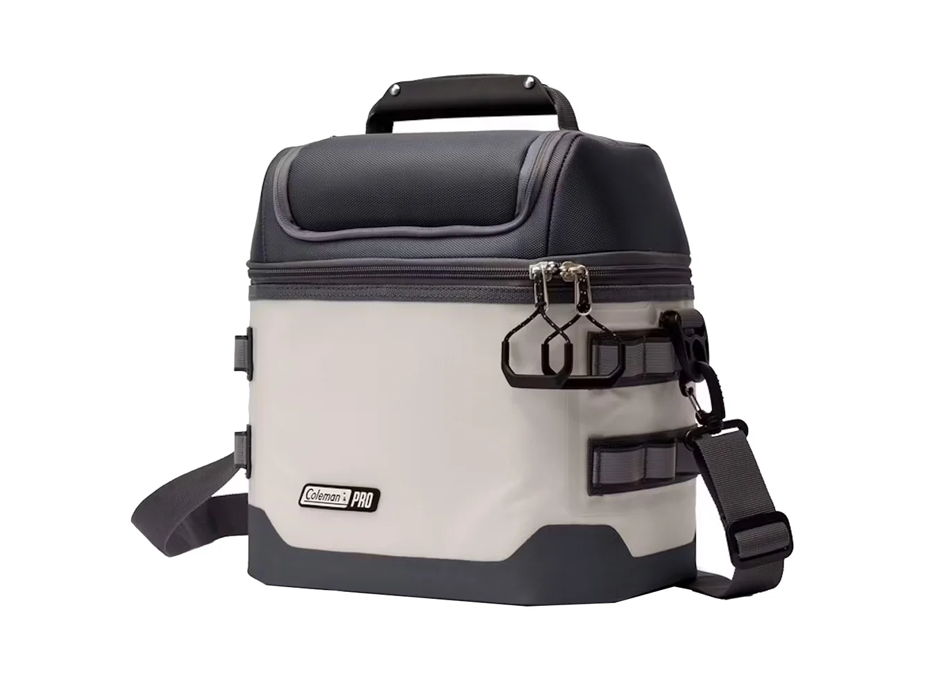 Coleman Pro is gear that works hard like you. It is purpose-built for everyday use in the most demanding environments. The Coleman Pro 16-Can Soft Cooler will keep your lunch and drinks cold while you put in the work, and a separate dry storage compartment keeps keys, phones, and more close at hand. Built tough, the durable exterior is puncture-resistant and backed by a 3-year limited warranty. The antimicrobial treatment to the interior helps protect it from odor-causing bacteria, while a compression-molded base protects the soft cooler to help prevent leaks. Throw the Coleman soft cooler over your shoulder to keep your hands free to carry toolboxes. Work smarter, not harder, with oversized zipper pulls for easy access in work gloves and reflective MOLLE webbing for extra storage.