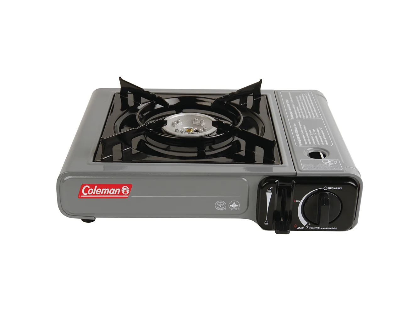 On-the-go cooking just got a little easier with the Coleman tabletop portable butane gas camping stove, 1 burner, gray. With an ultra-portable design and included carry case, this stove is ready for any camping adventure and quickly sets up on any outdoor tabletop, supporting up to a 10-inch pan. Attach an 8.8 oz. Butane cylinder, light the automatic matchless ignition with the turn of a knob, and in no time, you’re cooking with up to 7,650 BTUs of power for up to 1.25 hours. Wind baffles shield your flame from the wind, and a large stable base makes stirring easy. Use your stove for years to come thanks to an easy-to-clean, durable porcelain-coated grate, rust-proof aluminum burner, and made-to-last enameled steel exterior.